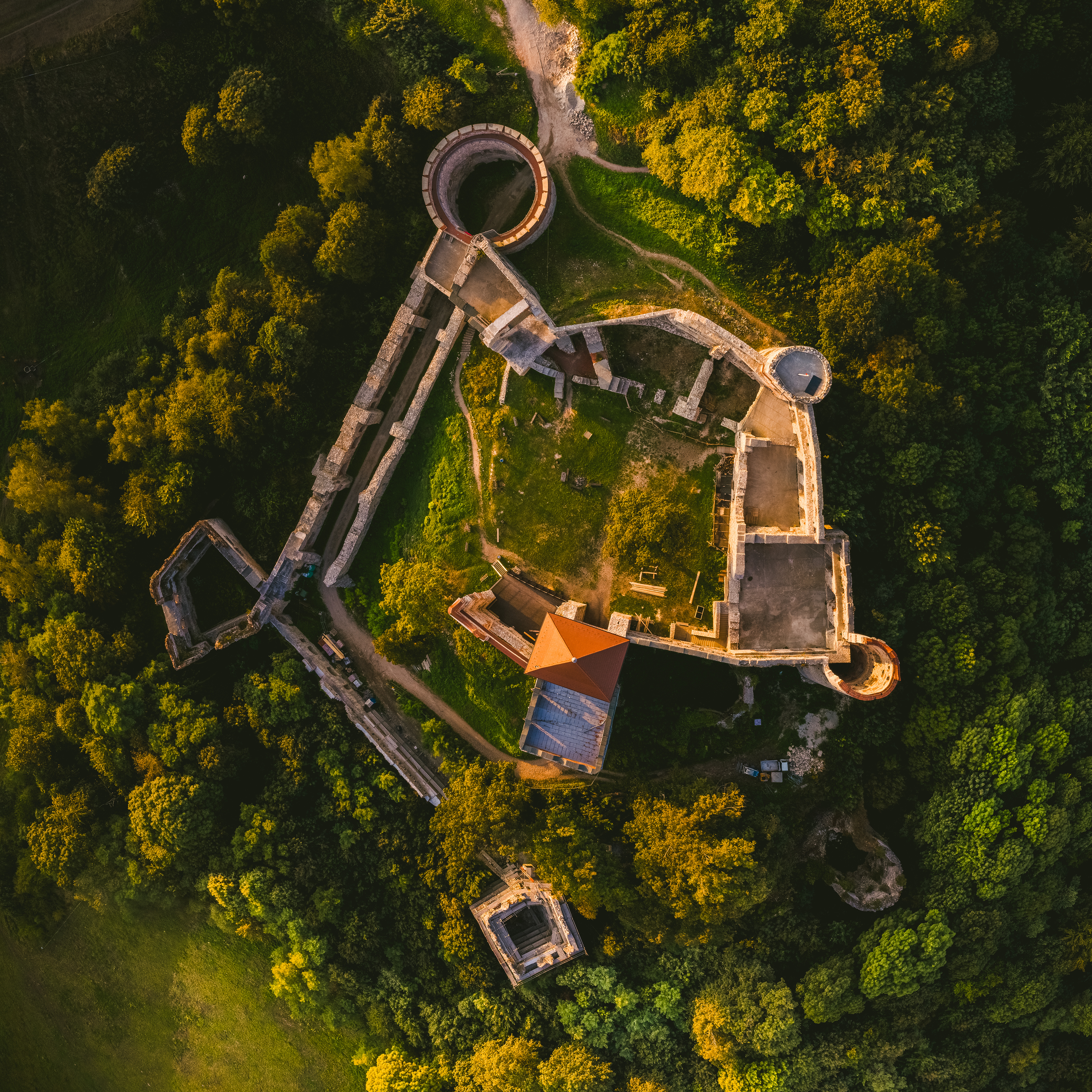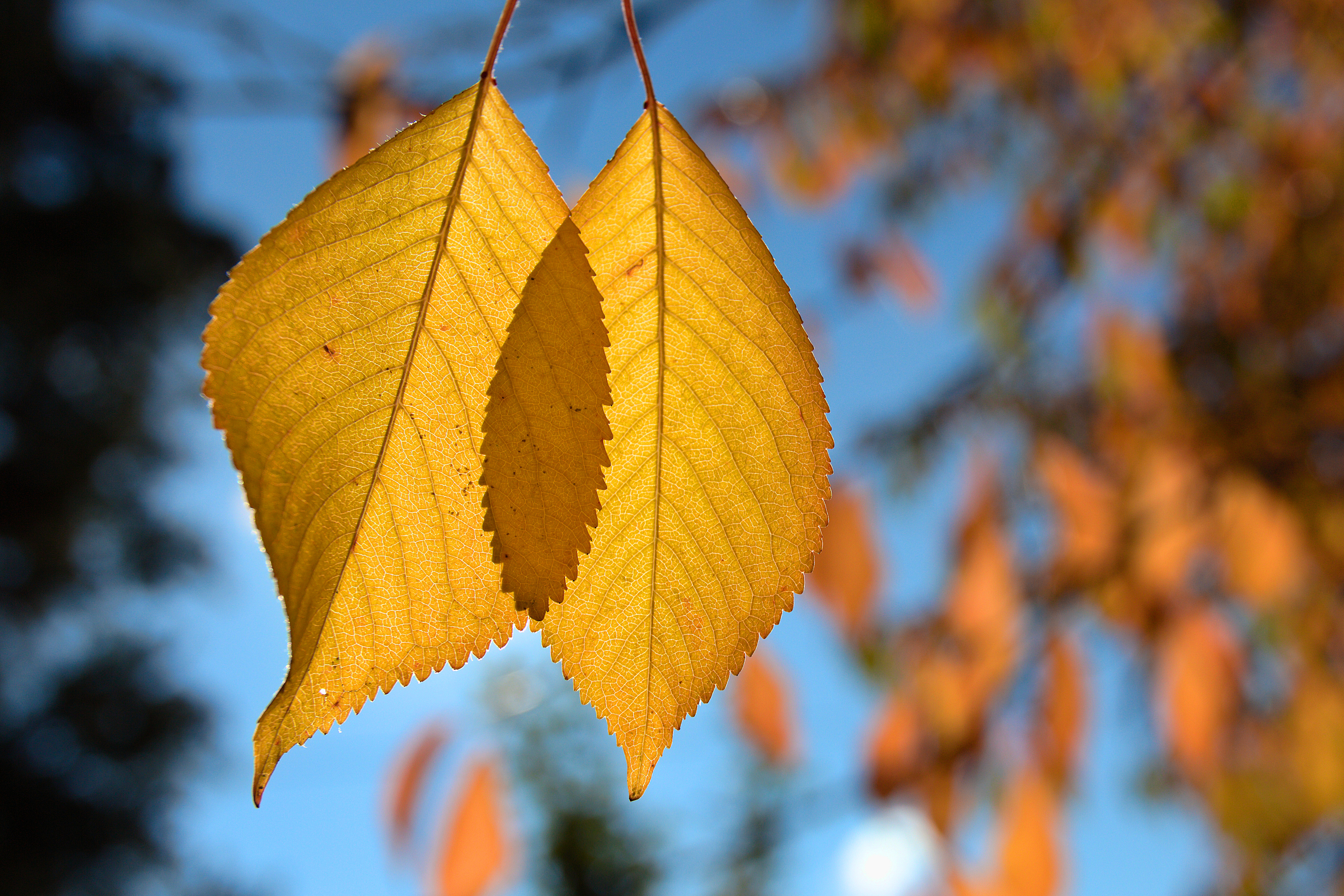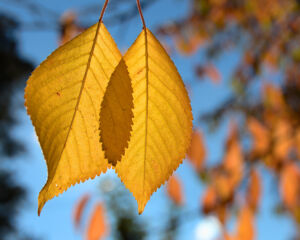 Jesienna interpretacja diagramów Venna. Podświetlone przez słońce liście są ciemniejsze tam, gdzie się pokrywają. Odpowiada to teoriomnogościowemu iloczynowi dwóch zbiorów.