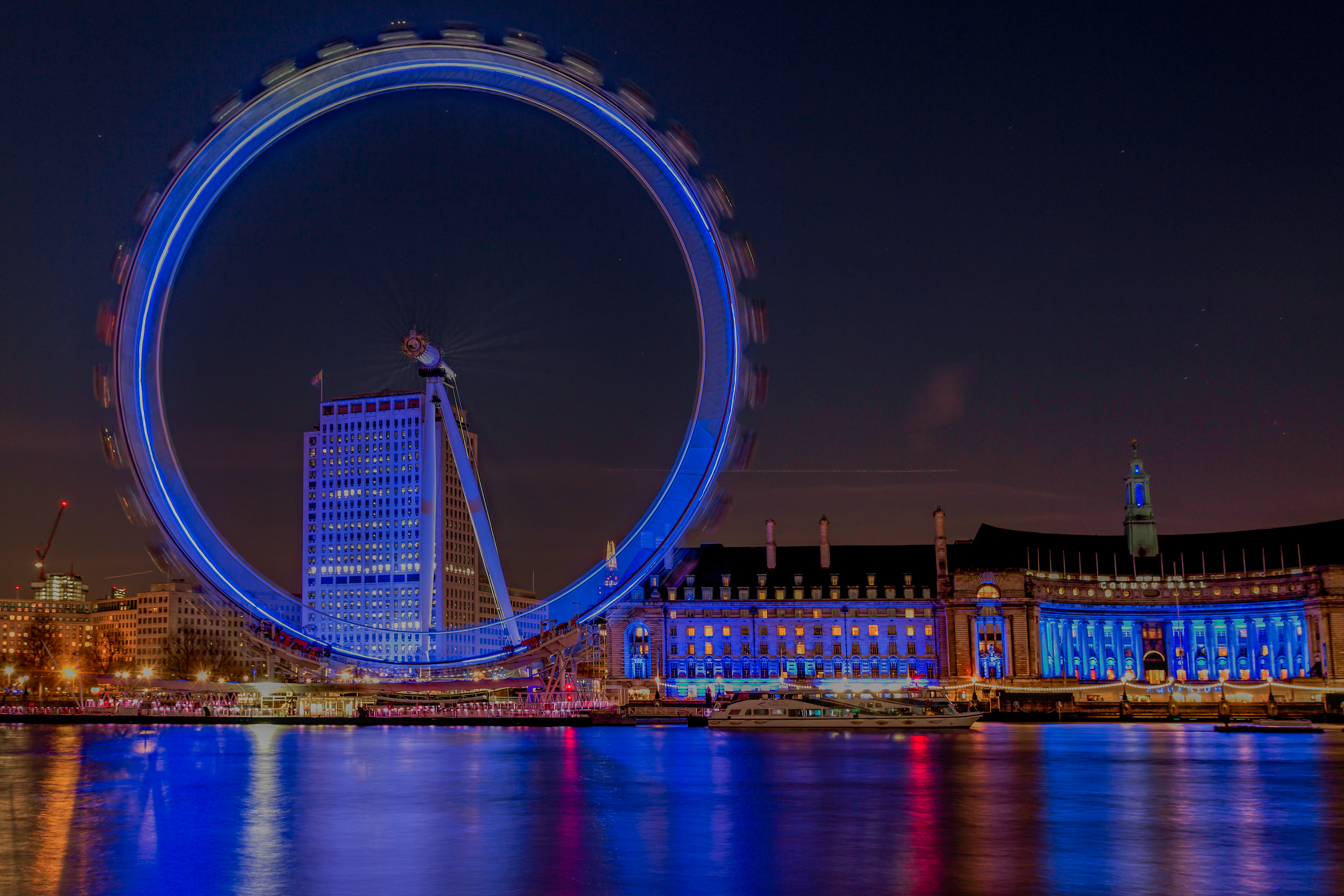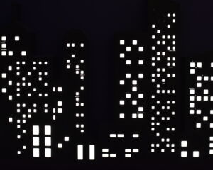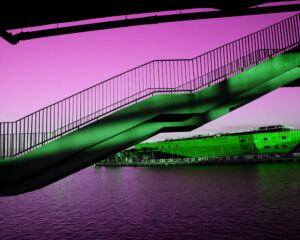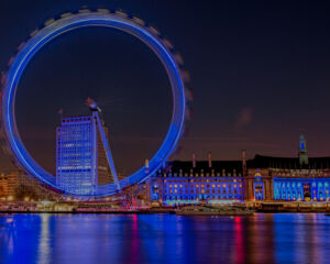 London Eye- przedstawia koło z widocznymi promieniami i promieniami świetlnymi, ramiona koła tworzą także kąt, widoczny w tyle poruszający się samolot stworzył prostą z punktami ,budynek po prawej widoczna symetria a jego dach to krzywa, lampki wzdłuż wybrzeża to krzywe z punktami, odbijające się na tafli wody światła tworzą kąty proste z linią brzegu. Kształty budynków i okien to figury geometryczne: prostokąty i kwadraty. Dźwig po lewej stronie to symbol pierwiastka.