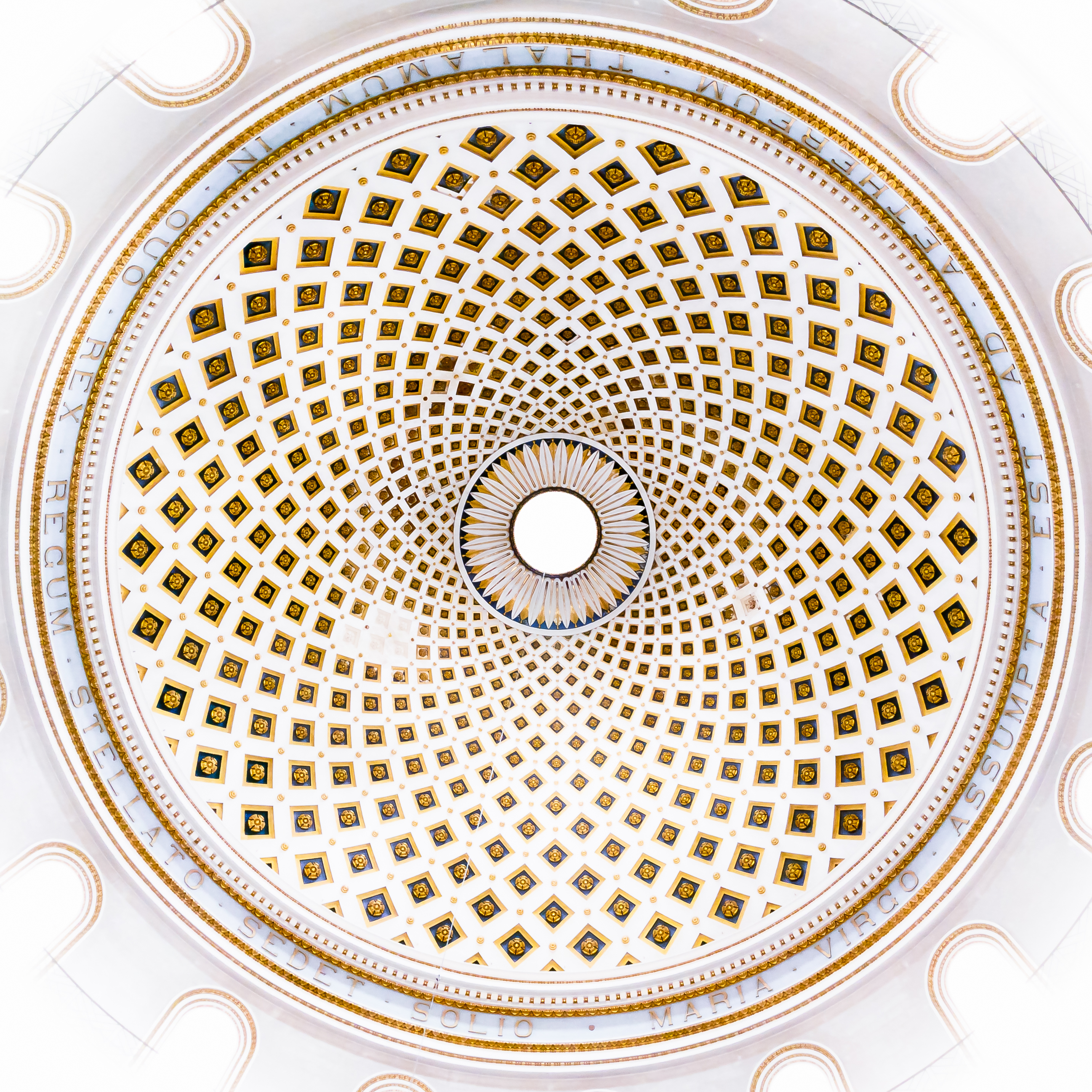 Każdy z okręgów kopuły Rotundy w Moście (Malta) składa się z 32 ozdobnych czworokątnych elementów. Zakładając, że okręgi powtarzałyby się w nieskończoność, liczbę ozdób w każdym okręgu dałoby się przedstawić wzorem f(x)=32.