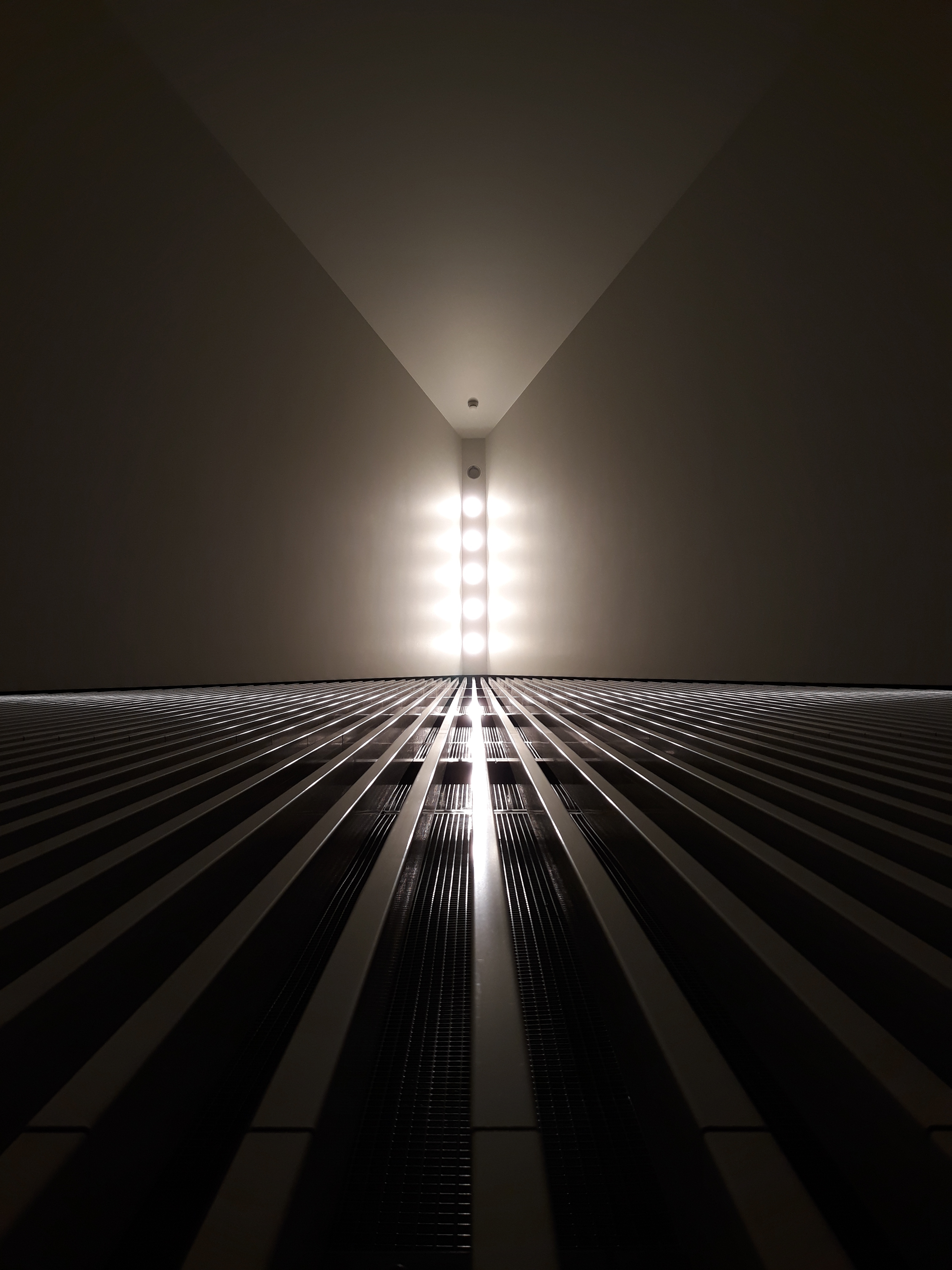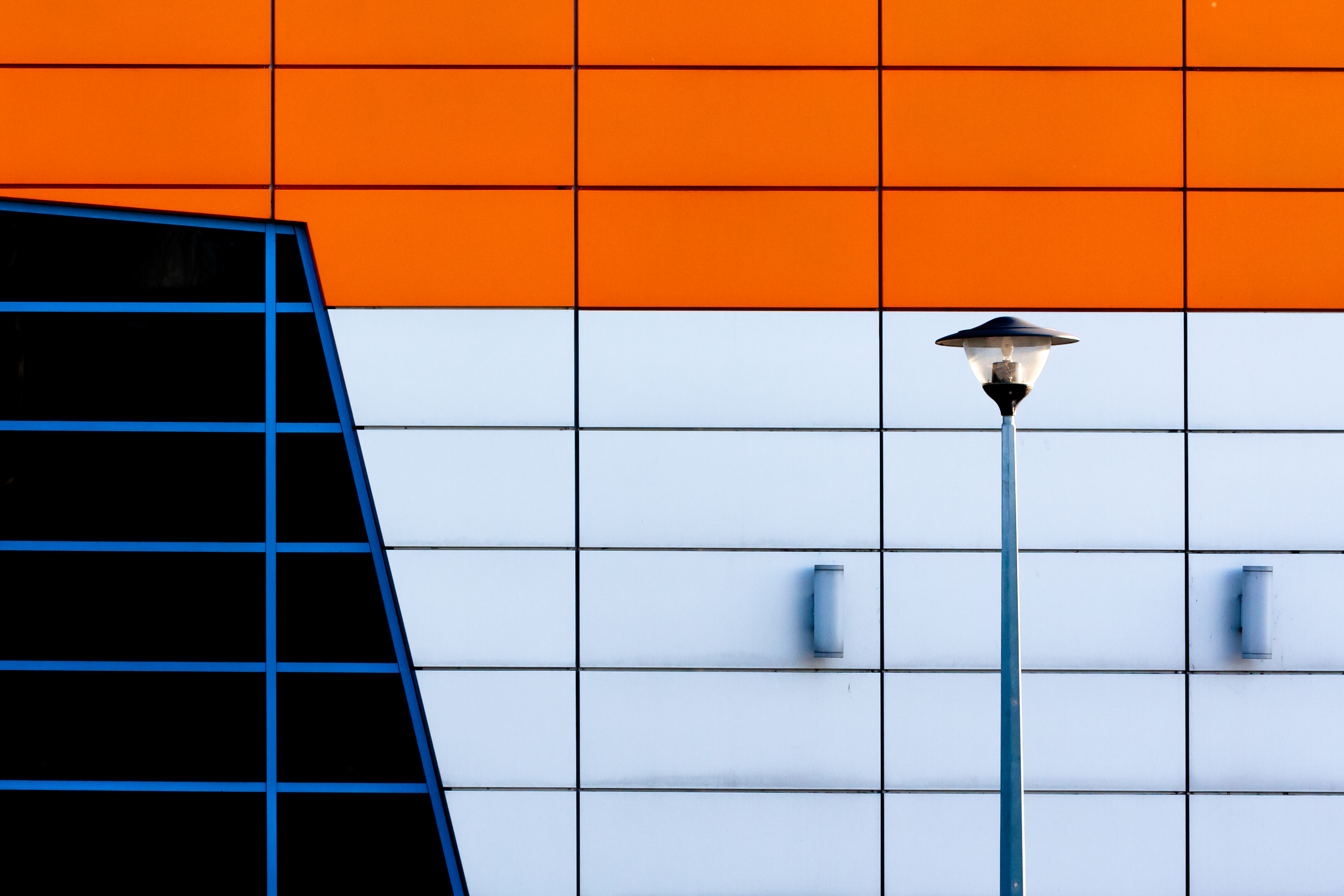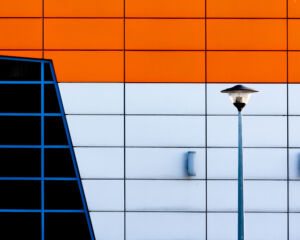 Zdjęcie przedstawia uliczną lampę na tle ściany budynku. Czasami wystarcza jeden krok, by dokonać „wizualnego” rzutowania , a tym samym, pozornego ograniczenia jednego wymiaru naszego trójwymiarowego otoczenia.