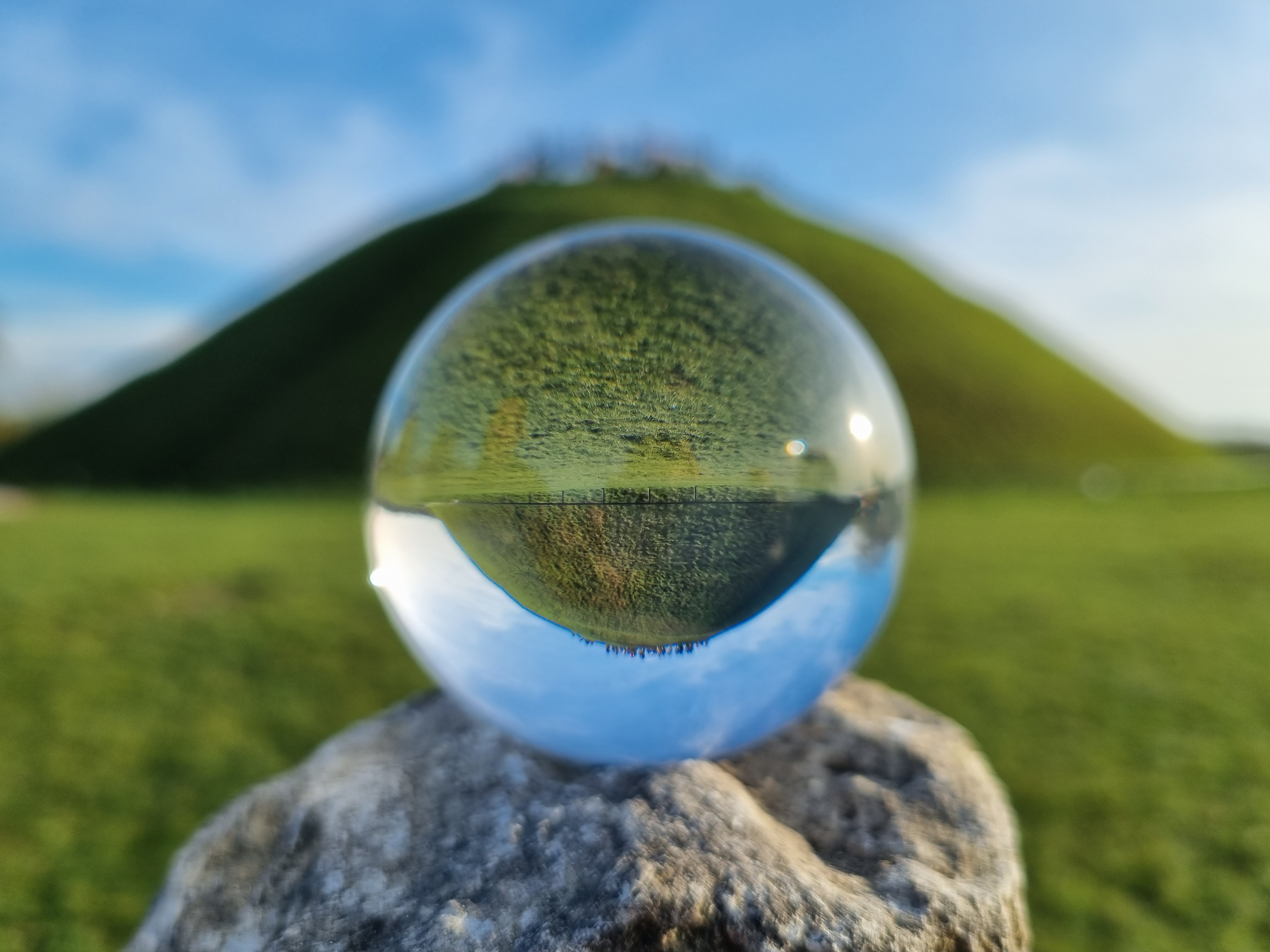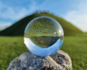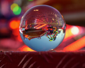 Jeśli nie wiesz, co jest po drugiej stronie, to spójrz w kulę. Kula jest naturalną ramą obrazu, ale nieco innego. Linie proste uległy zakrzywieniu, obraz jest odwrócony do góry nogami. Widzimy tutaj łuki geometryczne, zakrzywienie sfery, refrakcję oraz linię prostą, na której spokojnie leży kula.