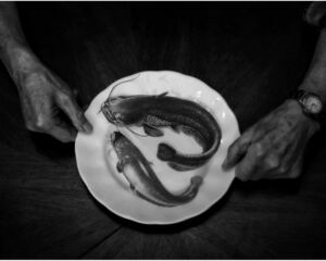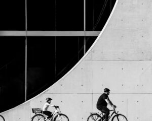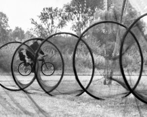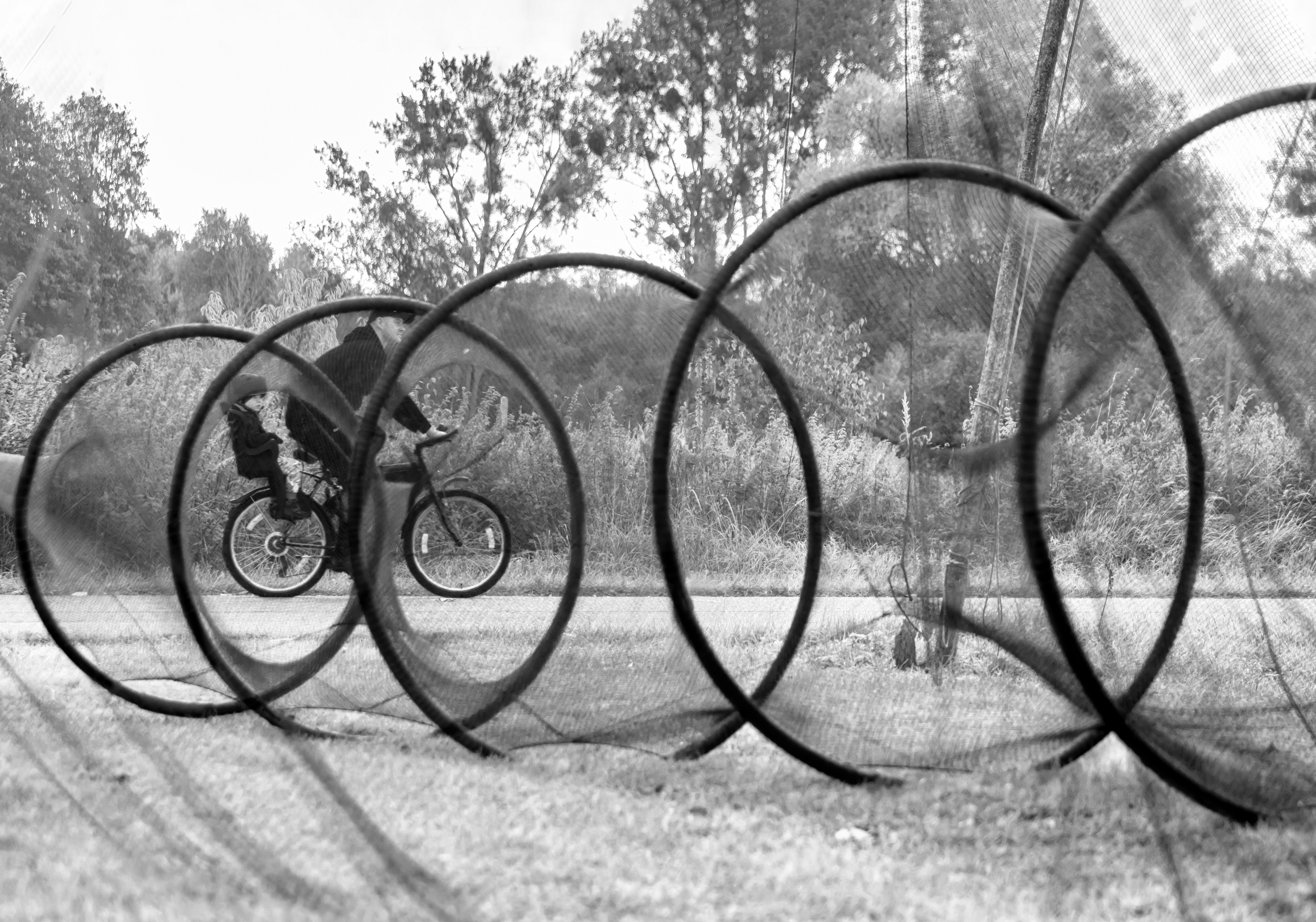 Fotografia przedstawia suszące się po połowie żaki. Ich siatkowa konstrukcja opiera się na kolistych obręczach. Stało się to dla mnie inspiracją do stworzenia kompozycji z geometrycznych figur, jakim są koła. Pomysł polegał na uchwyceniu chwili, w której pojawi się rower, aby dopełnić zdjęcie okręgami "Z innej bajki" i podkreślić geometrię kół.