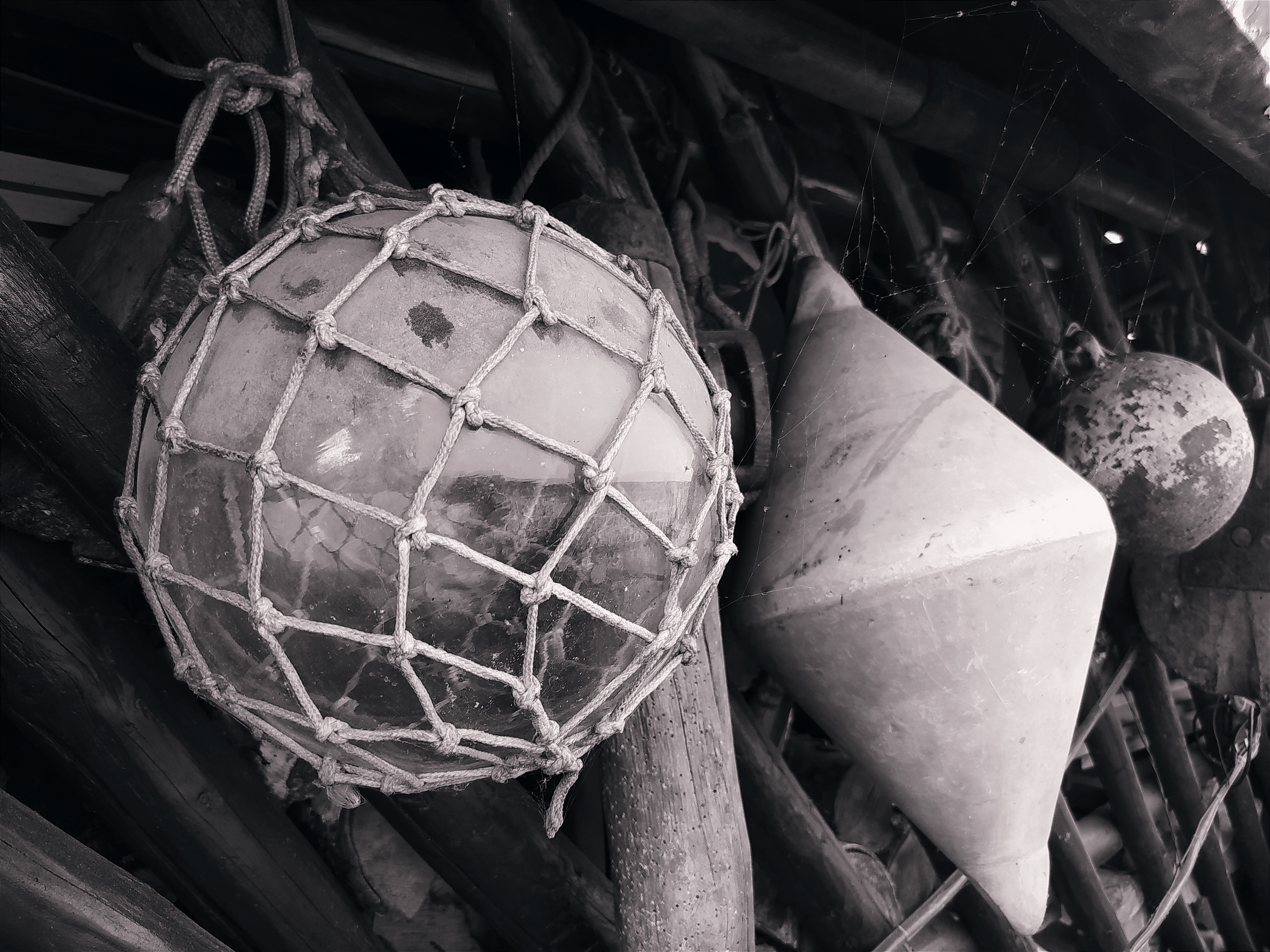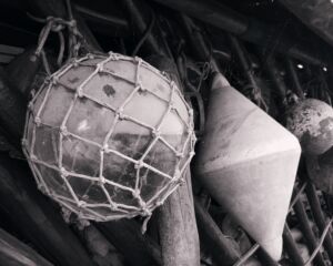 Fotografia przedstawia zabytkowe, rybackie pływaki (kule) i bojkę (stożek prosty podwójny). Pływaki były wykorzystywane w rybołówstwie a bojka w celach nawigacyjnych. Pływaki i bojka to kolekcja mojego dziadka, który przez wiele lat był rybakiem na Zalewie Wiślanym.