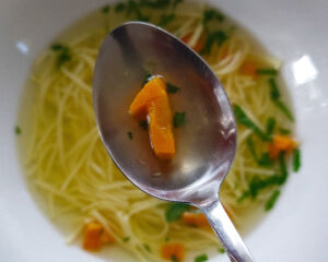 Fotografia przedstawia marchewkową jedynkę w rosole. Prawdę w logice matematycznej określa się znakiem "1"